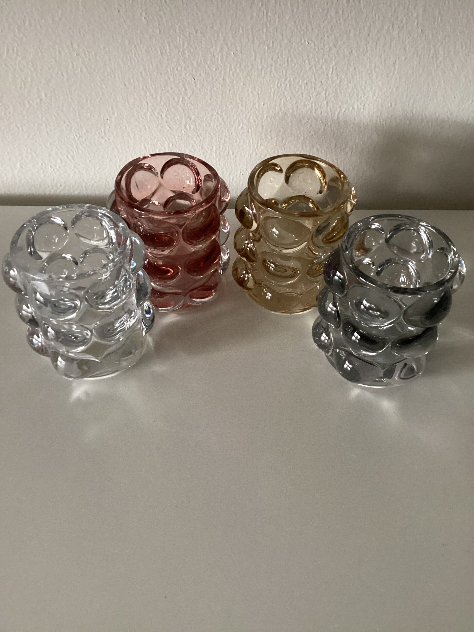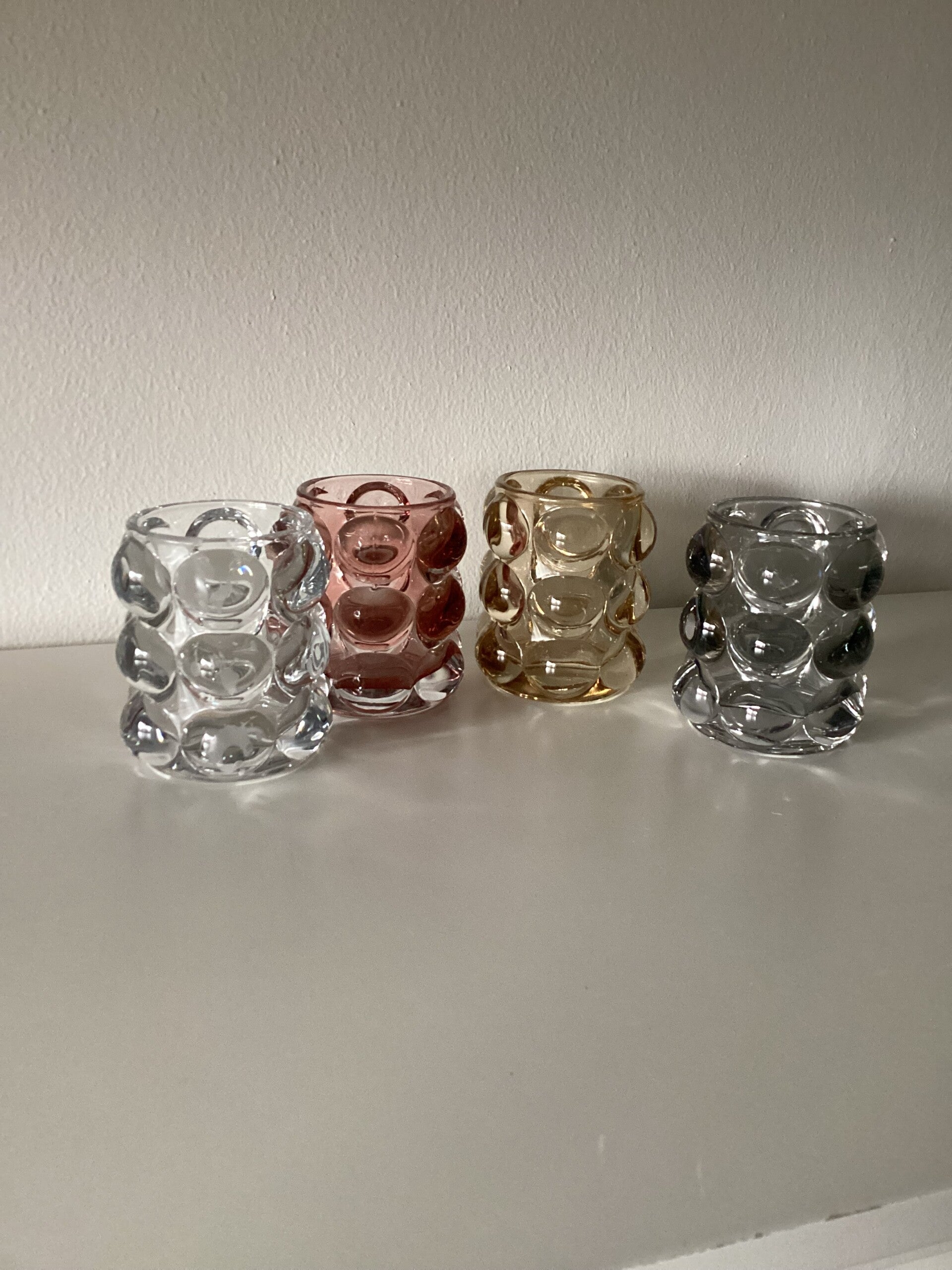 Wat een leuke waxinelichthouders. Gemaakt van stevig glas met een Bubble uiterlijk. Passen in elk interieur en zijn goed te combineren met andere items in dezelfde kleuren. Verkrijgbaar in 4 kleuren: Smoke/Helder/Roze/Amber (dit is een goudachtige kleur)