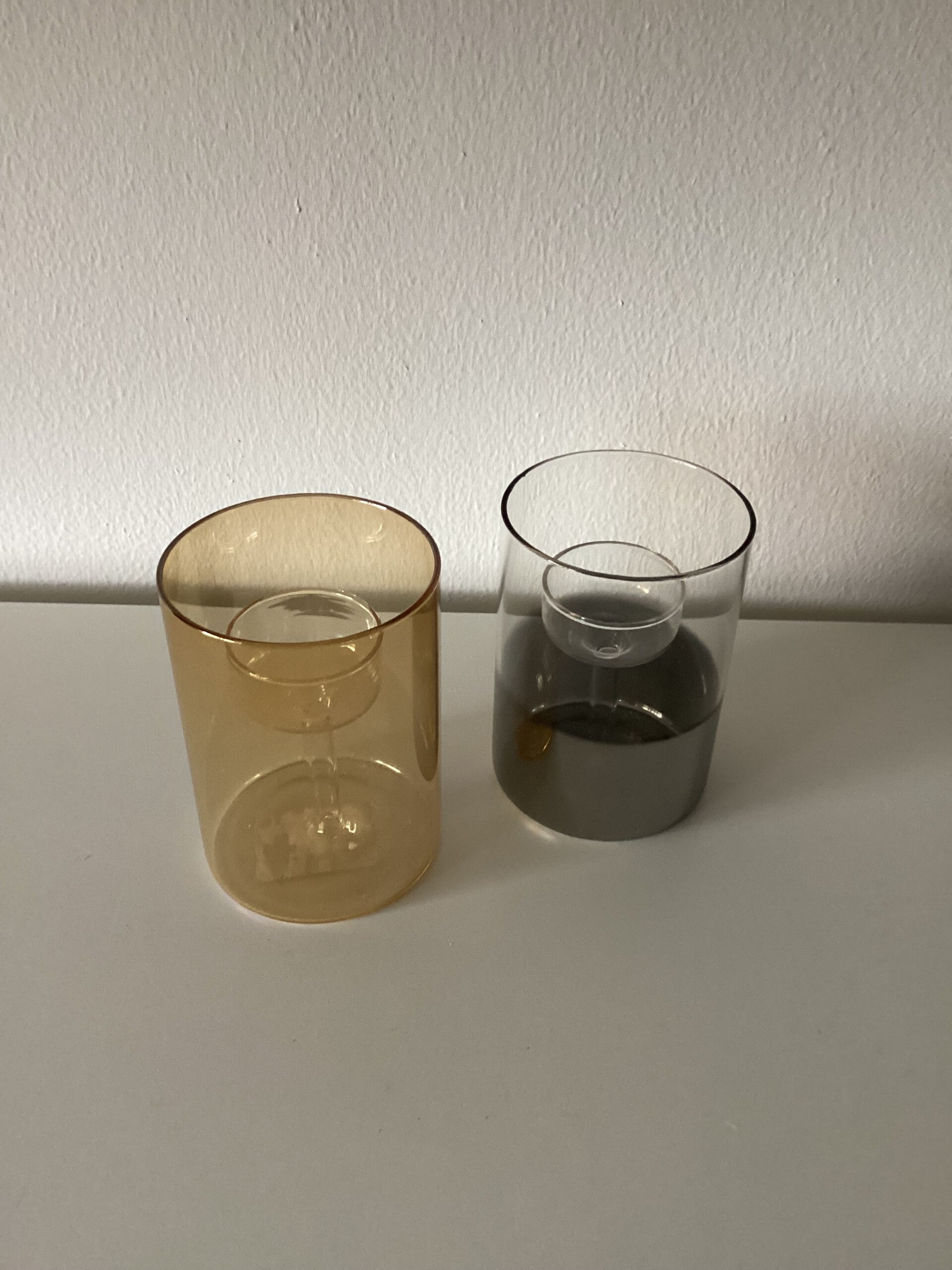 Leuke houders voor een waxinelichtje. In het glazen omhulsel staat een kleiner glaasje op een voet waar een waxinelichtje in past. Verkrijgbaar in 2 kleuren Amber en Smoke glas.