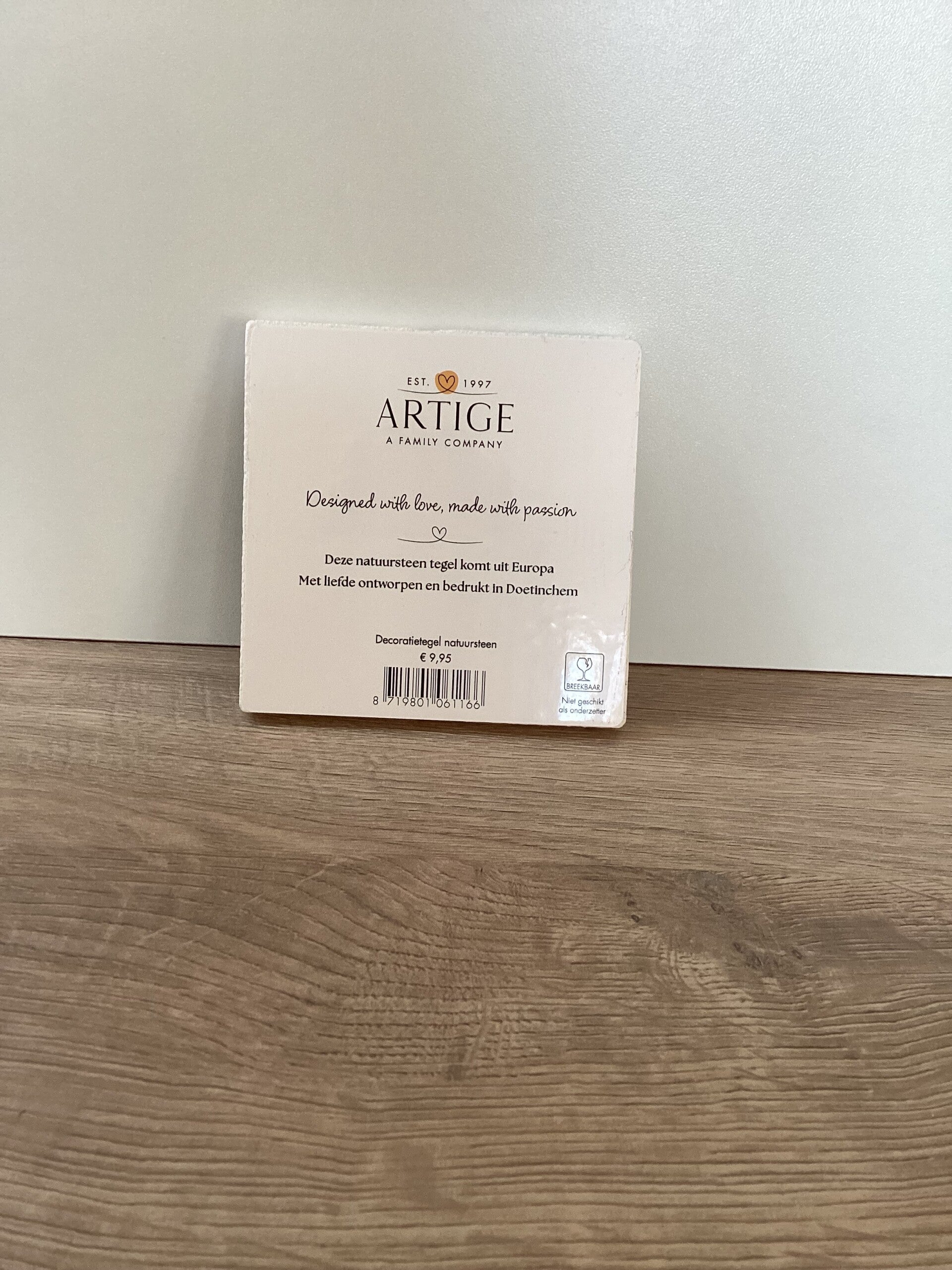 Zet het keramieken tegeltje van 10x10 cm op een plankje of geef ze een ander plekje in je huis.